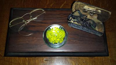 I inherited a very old music box. My mother inherited it from her grandfather who was born in 1867 so I know it has been in our family for a long time. It is not particularly fragile but it has seen better days; it was badly repaired in the past. When my mother passed it to me she told me that in her lifetime it never worked despite her bringing it to someone who tried to make it play and only managed to use awful wood putty to repair it's hinges. It lives in my living room on a book shelf. I have placed my grandmother's glasses, my great great grandfather's glasses and glass globe that belonged to my (deceased father).